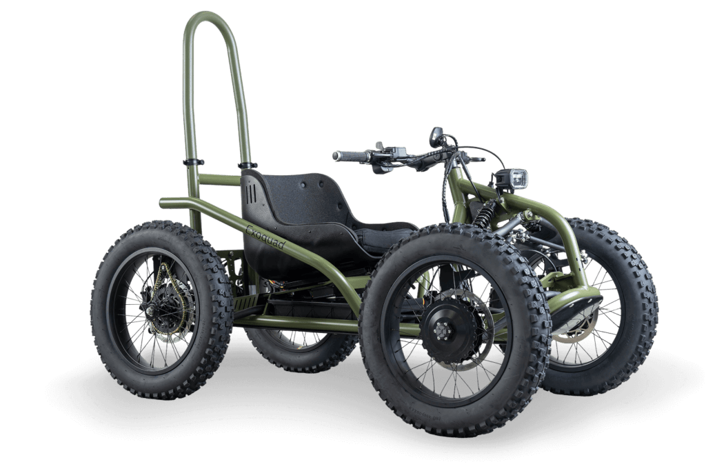 L’EXOQUAD est équipé d’une suspension réglable, d’un accélérateur type gâchette, d’un guidon large et d’un siège réglable en profondeur selon les préférences personnelles et les exigences de l’utilisateur.