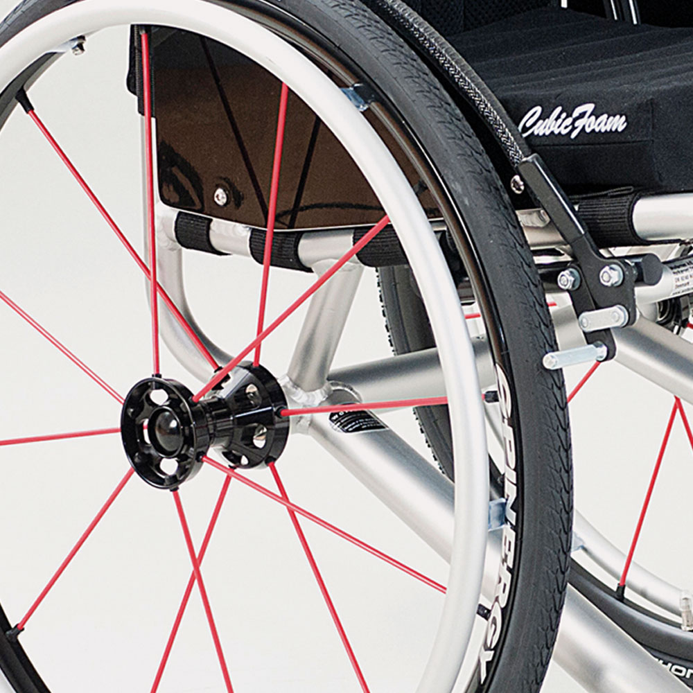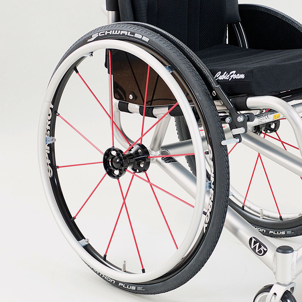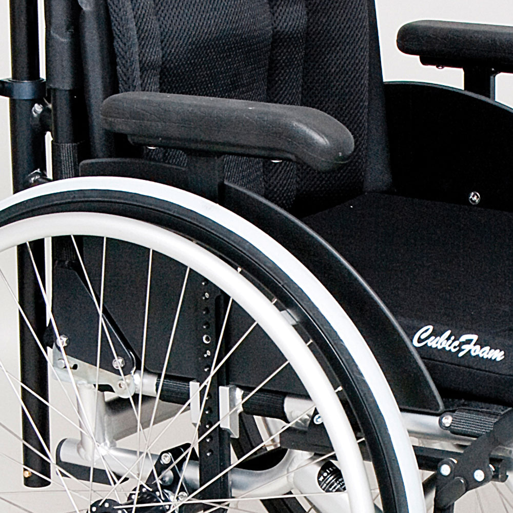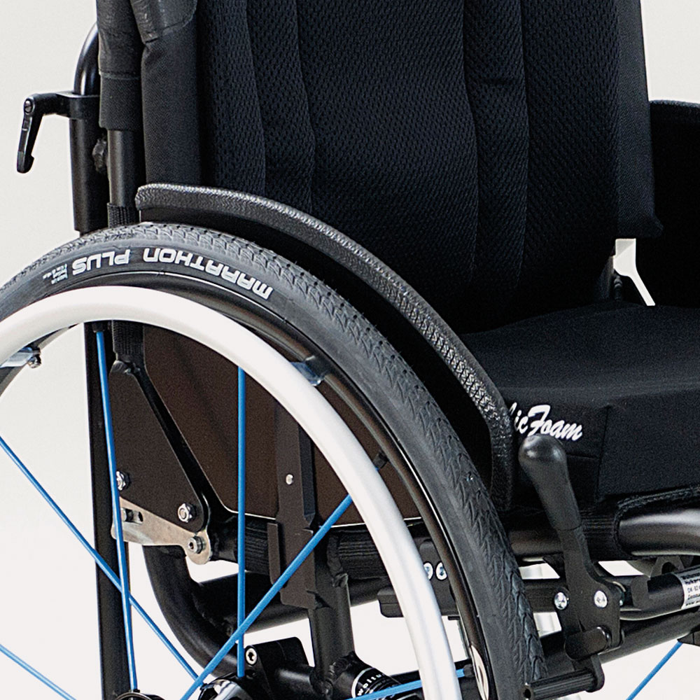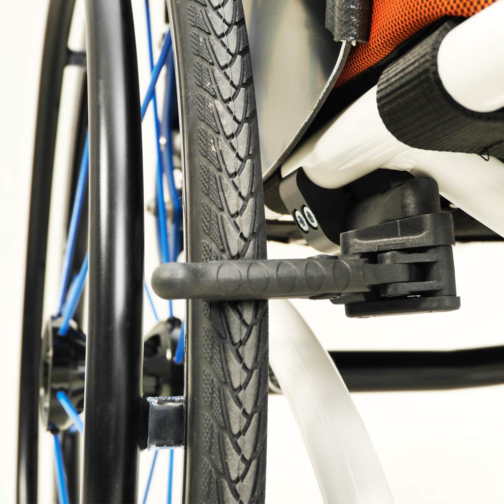 Dalton est un fauteuil roulant rigide actif avec des repose-pieds séparés et amovibles qui sont réglables en angle et en hauteur.